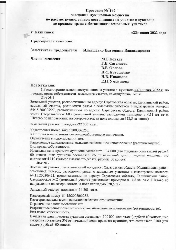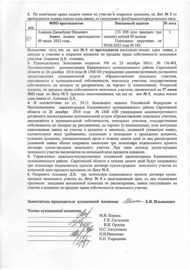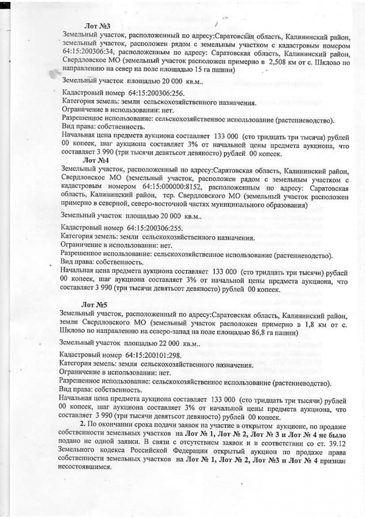 Администрация Калининского муниципального района Саратовской области сообщает о результатах открытого аукциона